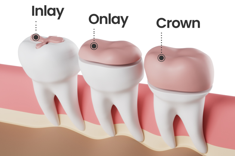 Onlays are dental restorations that cover a larger portion of the tooth surface, often used to repair moderately damaged teeth while preserving healthy tooth structure.